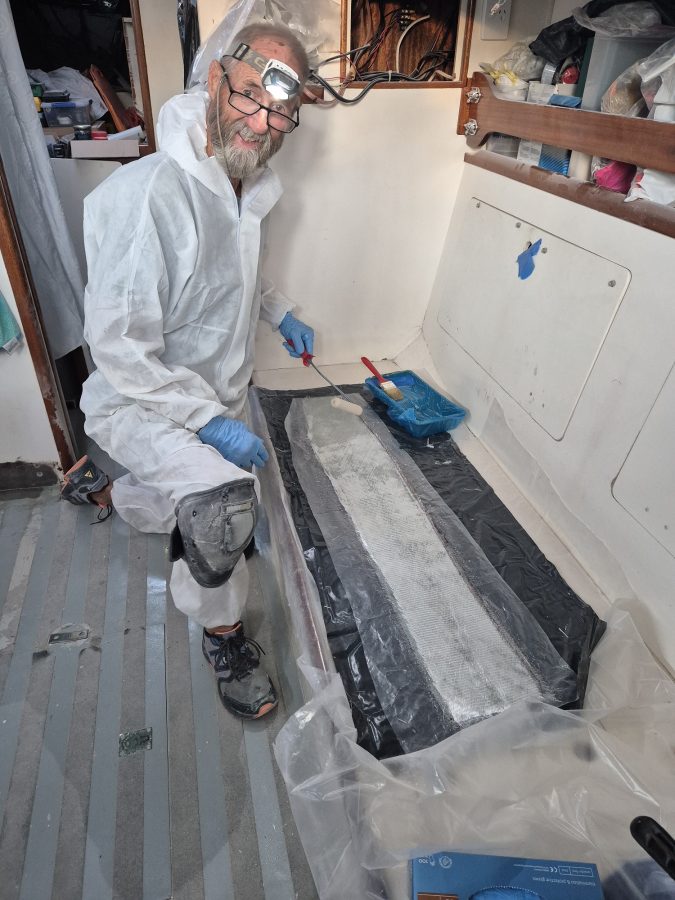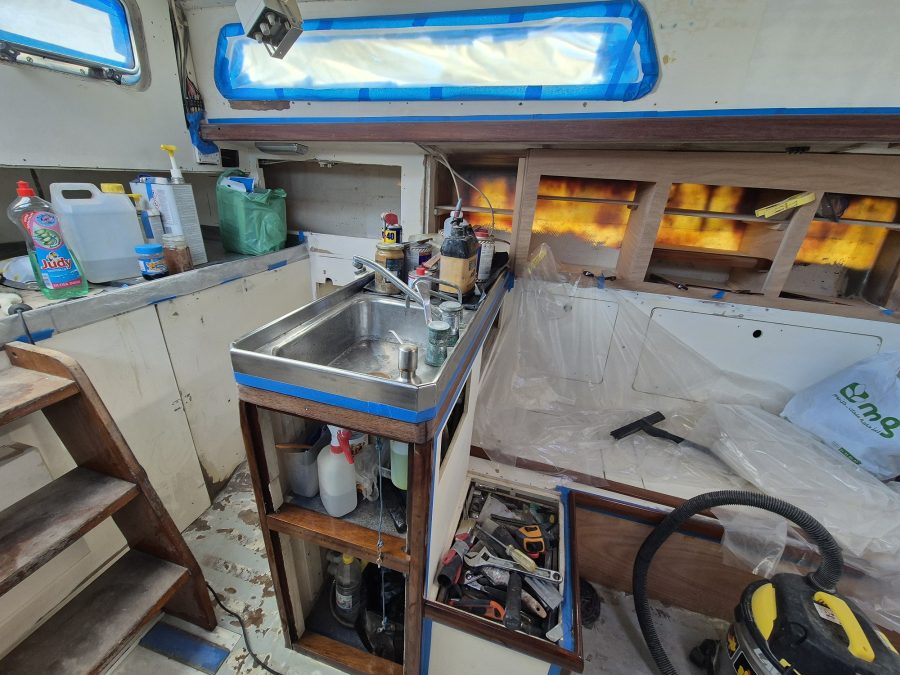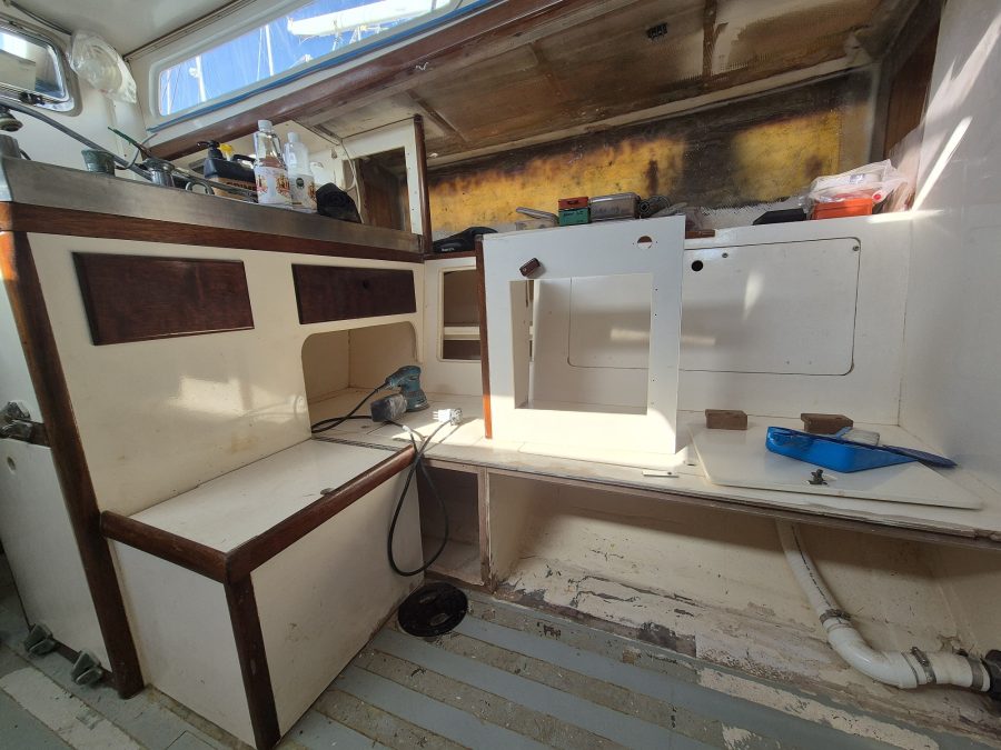 During the wet stormy weather, Lane was able to get on with building the interior cabinets with the help of a local cabinet maker who built the cabinet doors as Lane does not have all the tools necessary on board for making these.