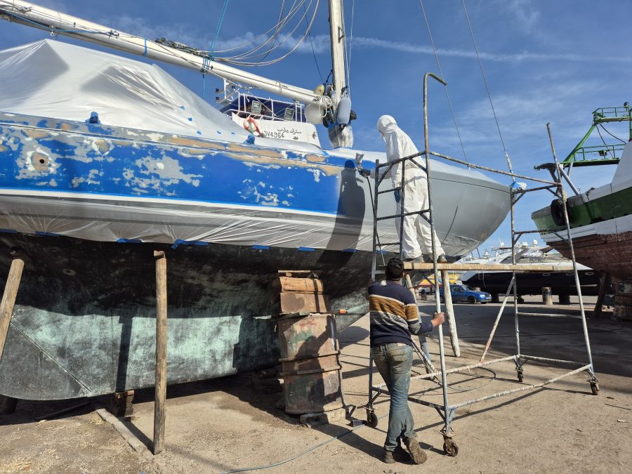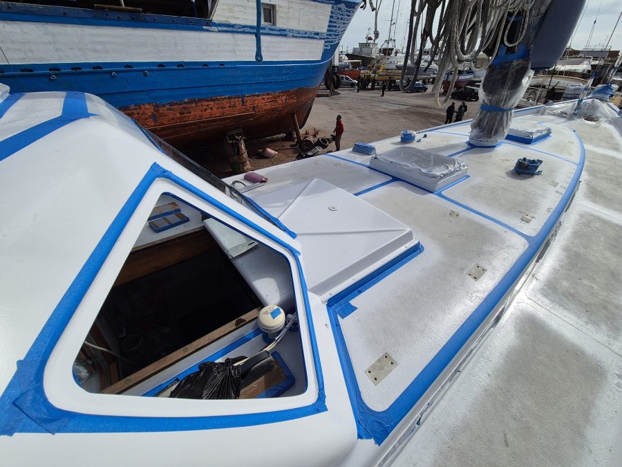 Meanwhile back in Tunisia, Lane had been working non-stop on the major repairs on Mai Tai. Luckily, he was still staying in the apartment, as it was now mid-winter which meant a lot of cold, wet and stormy weather. Not ideal conditions to be preparing for a major paint job. He had removed every bit of deck hardware including all eight winches, and sanded the non-skid off the deck, cabin top and hard top. The major damage was on the port side, but it was difficult to paint just half a boat. At what point do you stop? A couple of boatyard workers were helping sand the hull in preparation for the paint job over the newly laid fiberglass.