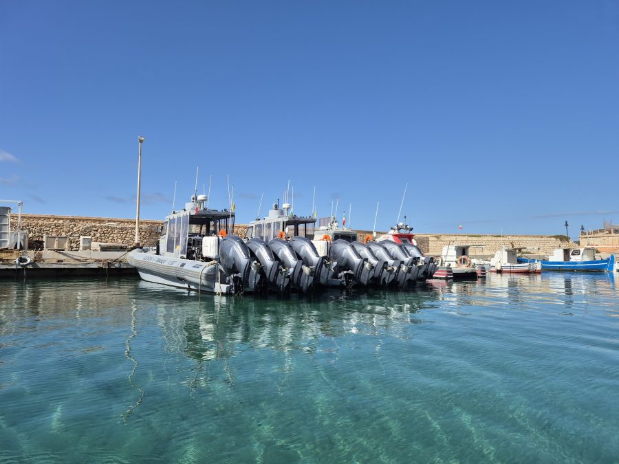 The small Italian island of Lampedusa lies just 200nms from North Africa, Libya and Tunisia being the closest countries, so there are often many boats of migrants attempting to escape these countries. Most of them head for Lampedusa, the closest landfall, and many of these are rescued from the overcrowded fragile craft they set out in. The Coastguard Police are from all areas of the EU, here to help control the influx of migrants trying to enter Europe. The line up of high-speed Coastguard boats are stationed ready for action.