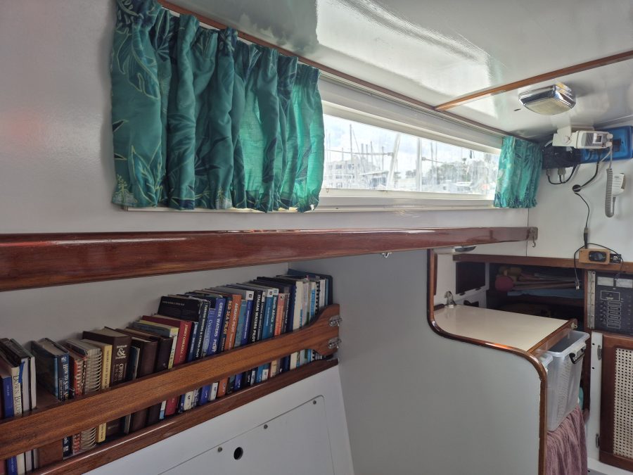 While Mai Tai was impounded at the Marina, we were able to get a huge amount of work done as we were still living in the apartment. Lane was able to finish all the varnishing projects, insert the cane into the cupboard doors, run new AC wiring throughout the port side, and painted the whole interior of Mai Tai, including the ceiling panels. This was difficult to do in with the intense heat, having to work early mornings and evenings. We then had to reassemble the entire boat so we could move back on board.
